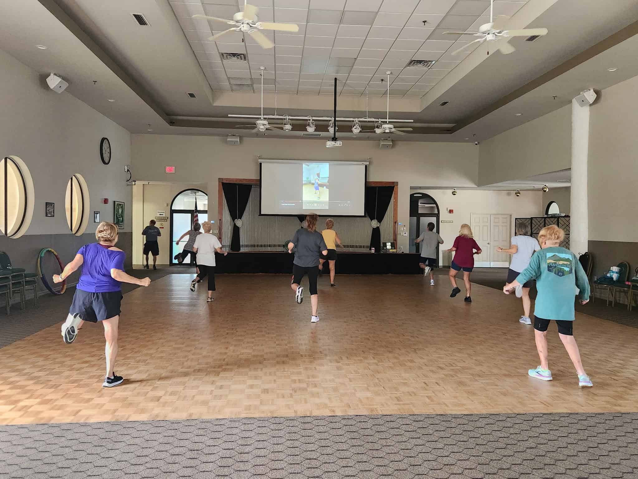 Pictured here is the latest rendition of Karen and Krisan and Nada’s Cardio-Jazz class. While Nada Pajavic is traveling for several weeks this summer the dedicated “jazz ladies” will still be stretching and dancing in the multipurpose room every Tuesday and Thursday at 10 a.m. (except the day the BOD meets there). Using technology to work out with Krisan’s videos on the big screen, the group can keep up with their aerobic exercise. Everyone is welcome and encouraged to “get in the groove.” We’re having fun. Contact Donna Milbee or Deb Denial for more information. We hope to see you on the dance floor.