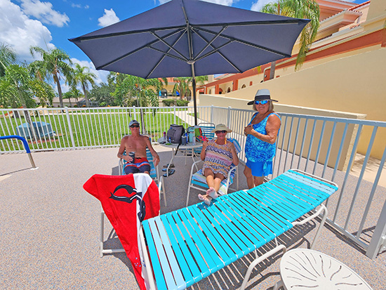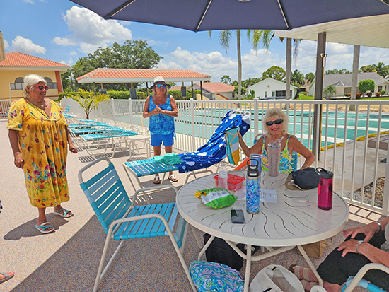 The additional umbrellas may be one of the most eye-catching improvements. When the umbrellas are all open, all of which have been donated by Sabal Springs residents, there will now be 60 feet of shade around the pool. The team even thought to provide laminated instructions on the tables sporting the large corner umbrellas for ease of use. Thanks to Carl Rozek and Sandy Reichling, one of the Aquacise instructors (Tuesdays and Thursdays), who donated the new teal table umbrellas and the Entertainment Committee provided funds toward the larger extension umbrellas. The Pool Committee and Aquacise class pooled donations to cover the cost of tax and delivery.