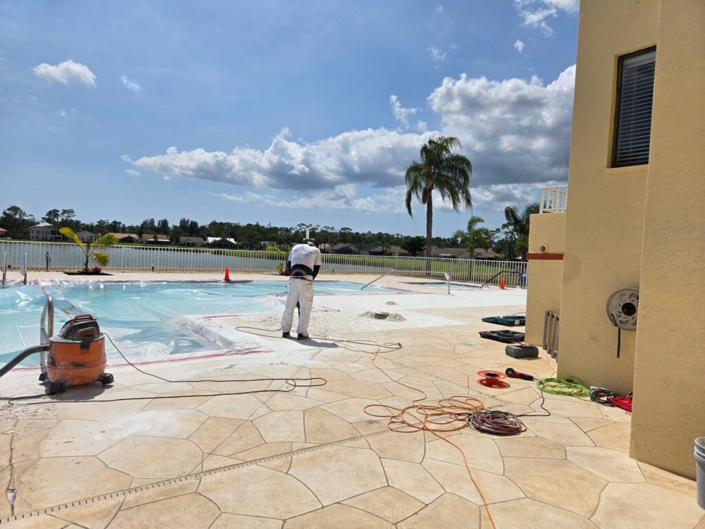Since March 28, 2024, the Pool Committee has focused on one goal: a resort worthy pool! After 30 years of daily use and weathering, the Sabal Springs pool area was in disrepair. The three-year-old surface had dangerous cracks and spalls but the company that installed it had gone out of business. The furniture was soiled beyond cleaning and the umbrellas were faded and ragged. So, a half dozen of the morning Aquacise ladies formed a committee that envisioned a “pool area worthy of a resort.”