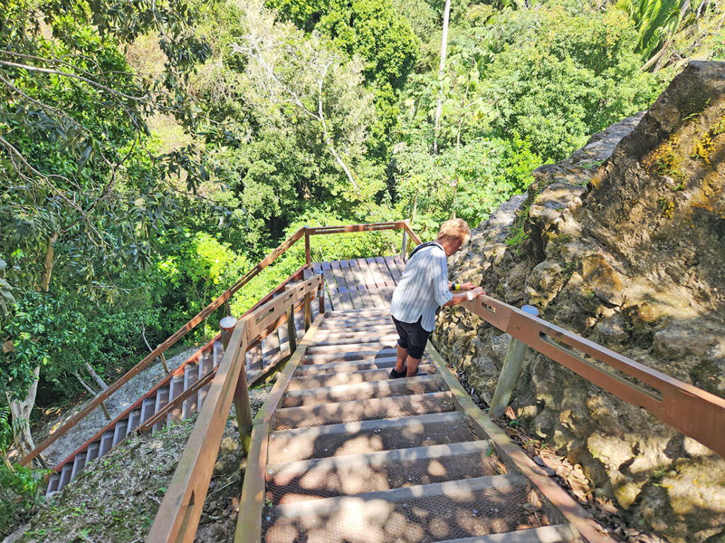 I wasn’t surprised that I was the oldest person to sign the waiver to climb 110 feet to the top of the Mayan Temple, which is one of the few you are still allowed to climb. My plan was to go as far as I could to take my photo then descend. I was concerned about coming down without a handrail. However, the climbing and descending is done on a staircase, erected behind and out of sight, including handrails. So, I have some beautiful photos from the top.